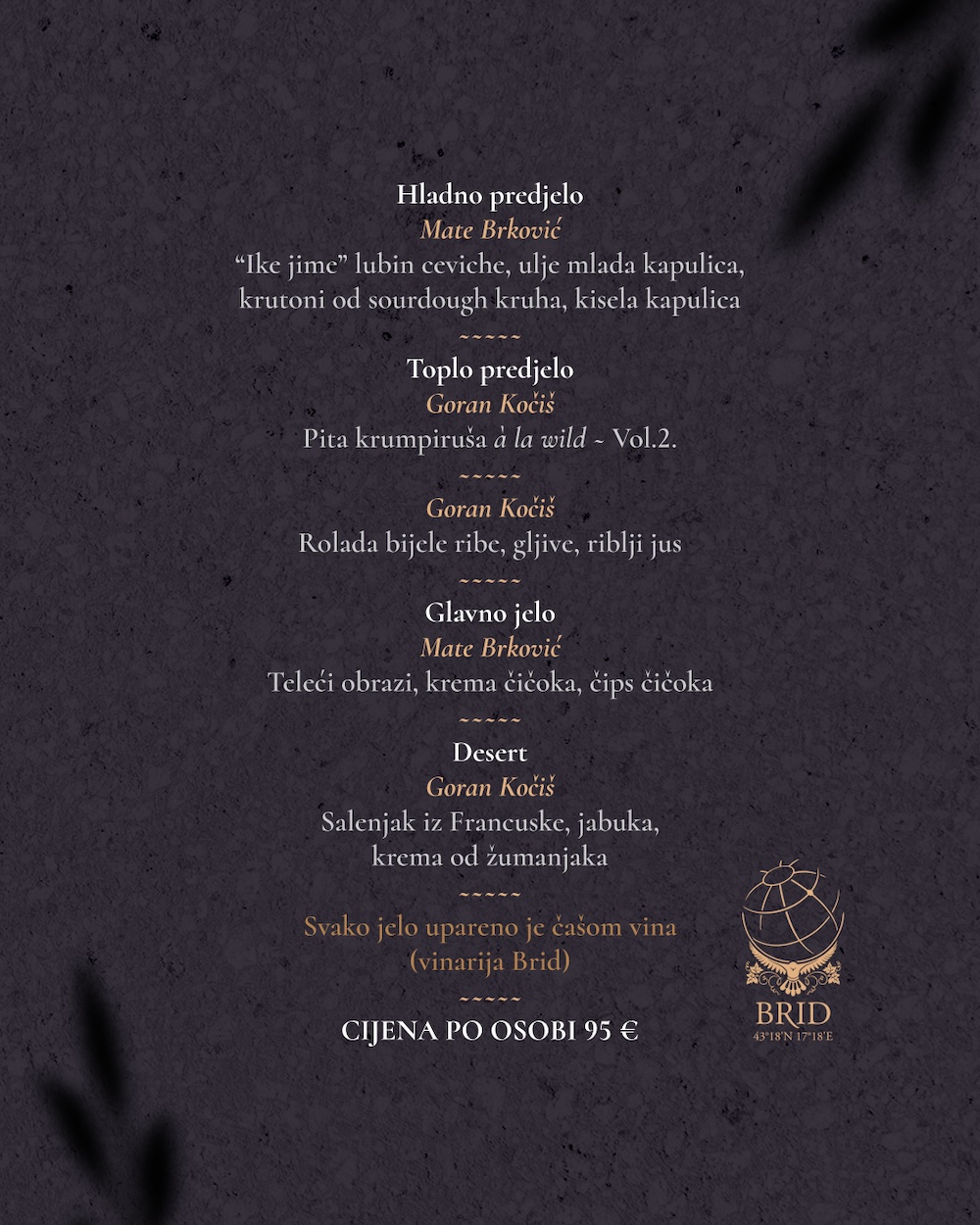 Kočiš, poznat po preciznosti i promišljenom pristupu gastronomiji, pripremit će večeru u pet sljedova u suradnji s domaćinom, chefom Matom Brkovićem. Svaki slijed bit će uparen s vinima vinarije Brid, pažljivo odabranima kako bi zaokružili autorski potpis večere.