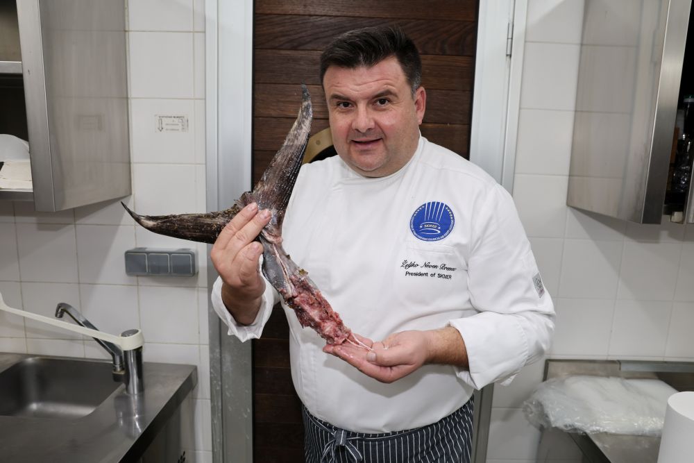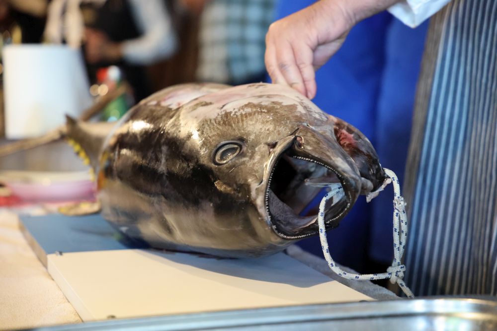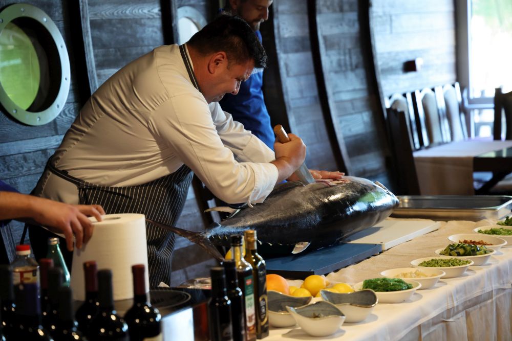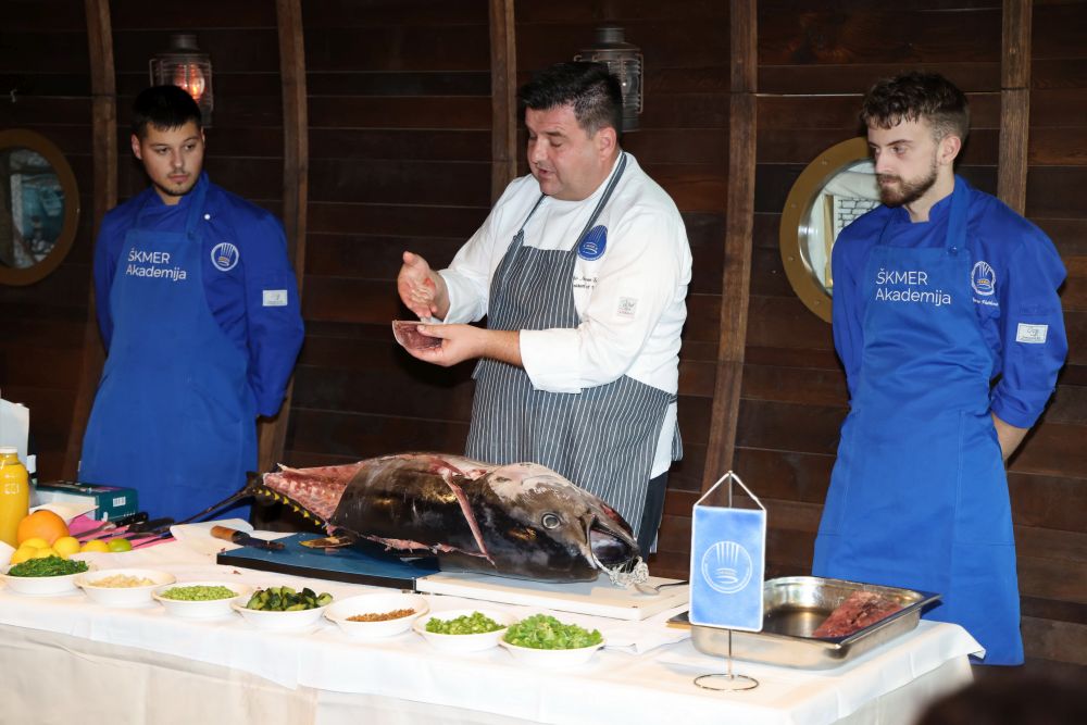 Tijekom demonstracije prikazao je tehnike otvaranja, filetiranja i rezanja tune, uspoređujući japanske i klasične europske noževe te objašnjavajući koje se vrste rezova koriste za različite kulinarske primjene. Naglasio je da za filetiranje koristi i žlicu jer 'skida meso sve do kosti'.