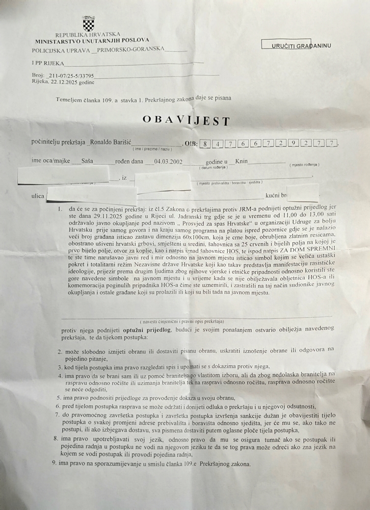 U obavijesti se također ističe da su sporni simboli korišteni u vrijeme kada se nije obilježavala obljetnica HOS-a niti je bila riječ o komemoraciji poginulih pripadnika te postrojbe, zbog čega su, prema policijskom tumačenju, uznemireni i zastrašeni sudionici javnog okupljanja i građani koji su se u tom trenutku nalazili na tom prostoru.