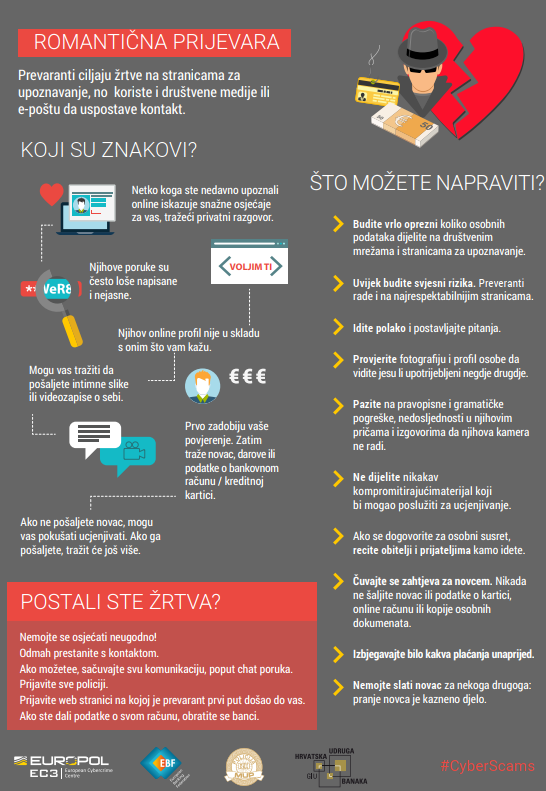 Počinitelji tzv. romantičnih prijevara kroz komunikaciju iskazuju snažne osjećaje prema žrtvi, a nakon što zadobiju njeno povjerenje traže novac, darove ili podatke o bankovnim karticama. Također mogu tražiti i da im žrtva pošalje osobne fotografije ili videozapise.