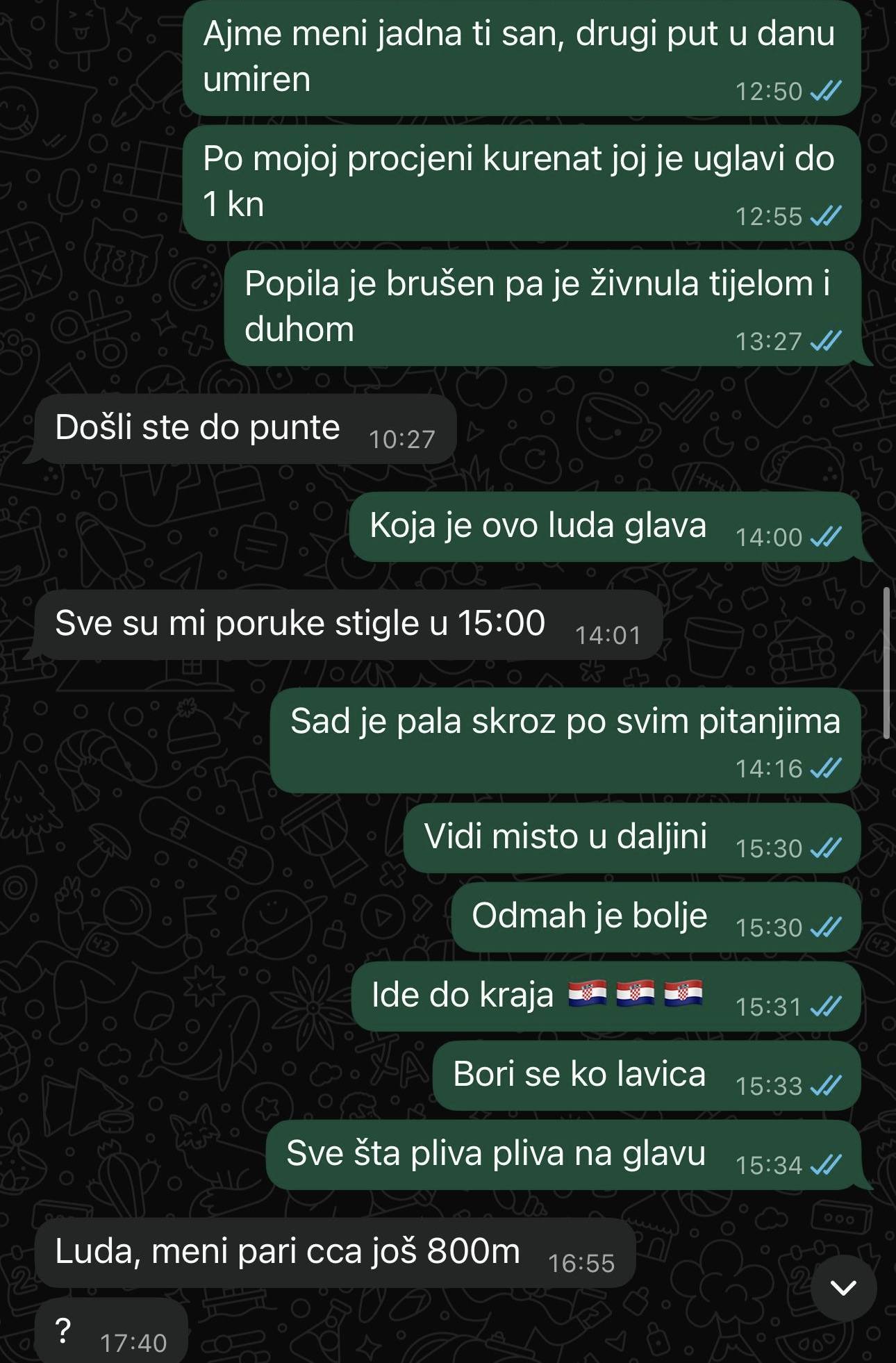 'Transkript gotovo jednosmjerne mamine komunikacije o svom 'ludilu' tijekom plivanja, jer interneta nije bilo gotovo cijelim putem. Pa sad vi recite, kome je teže', poručila je Dina.