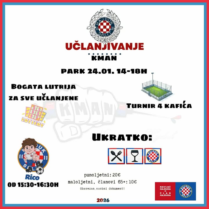 Na Kmanu se 24. siječnja održava učlanjivanje u Hajduk uz bogat popratni program i druženje za sve generacije. Događanje će se održati u parku na Kmanu u vremenu od 14 do 18 sati.