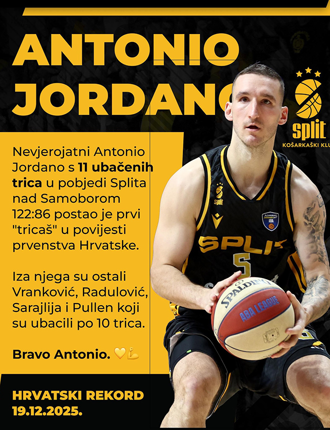'Nevjerojatni Antonio Jordano s 11 ubačenih trica u pobjedi Splita nad Samoborom 122:86 postao je prvi 'tricaš' u povijesti prvenstva Hrvatske.
