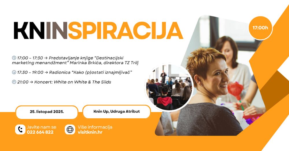 Knin će u subotu, 25. listopada 2025., biti domaćin događaja 'KNINspiracija - Kako (p)ostati iznajmljivač?', koji organizira Turistička zajednica grada Knina s partnerima. Cilj je događaja potaknuti edukaciju, razmjenu iskustava i razvoj turizma kroz praktična znanja i inspirativne priče.