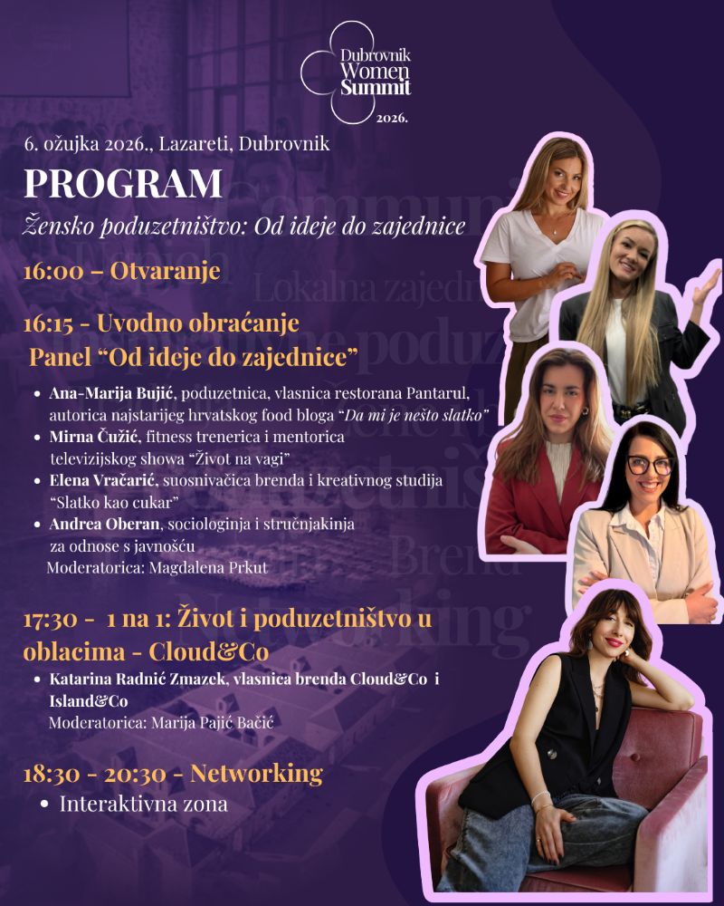 'Pod sloganom 'Business. Community. Inspire.' ovogodišnji summit donosi temu 'Od ideje do zajednice - snaga communityja u poduzetništvu'. U vremenu kada tržište postaje sve dinamičnije i zahtjevnije, upravo zajednica postaje ključ održivog poslovanja i dugoročnog uspjeha. Kako od osobne ideje izgraditi brend iza kojeg stoji lojalna i angažirana zajednica? Kako različiti sektori mogu doprinijeti razvoju ženskog poduzetništva? Odgovore donosi bogat popodnevni program koji započinje okupljanjem u 16 sati, a završava druženjem i umrežavanjem u interaktivnoj zoni', ističu organizatori.