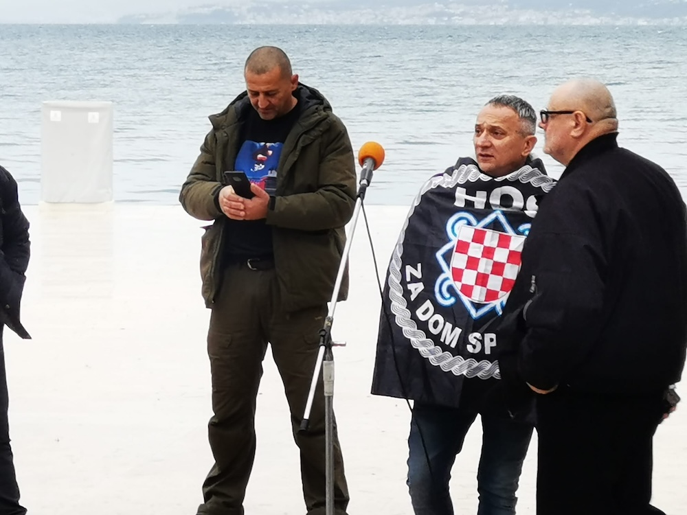 'Došli smo reći Ivani Marković, da je ovo Hrvatska, da ovo nije Jugoslavija, da je HOS branio hrvatsku državu i da je HOS stvarao hrvatsku državu. Nezamislivo je i osuđujuće što njoj smeta mural HOS-a, što je ona izdala zapovijed da se skine grb HOS-a s pomorskog dobra u vlasništvu Lučke kapetanije, ne u vlasništvu Grada Supetra. Znači, ona je to tim činom učinila nezakonito kazneno djelo. Zato molim vas, idemo joj poručiti i došli smo joj poručiti da joj neće proći nikakve parole protiv hrvatske države. Znamo, Ivana Marković, da ti ne voliš Hrvatsku, da ti patiš još za Jugoslavijom', kazao je Dražen Keleminec.