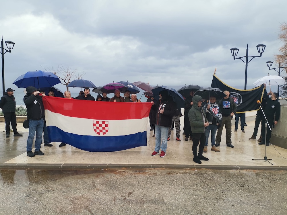 Desničari su održali prosvjed u Supetru, ispred gradske uprave i murala s imenom vukovarskog heroja Jean-Michela Nicoliera na koji je naknadno napisan i uklonjen grb HOS-a s natpisom 'Za dom spremni.