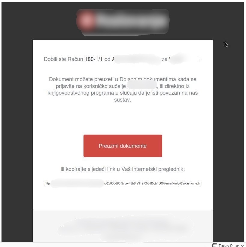 Riječ je o porukama koje izgledaju kao legitimne obavijesti o zaprimljenom dokumentu, najčešće računu ili otpremnici te sadrže gumb poput 'Preuzmi dokumente'. Vizualno su vrlo uvjerljive i na prvi pogled ih je teško razlikovati od stvarnih poruka koje građani i poslovni subjekti svakodnevno primaju.