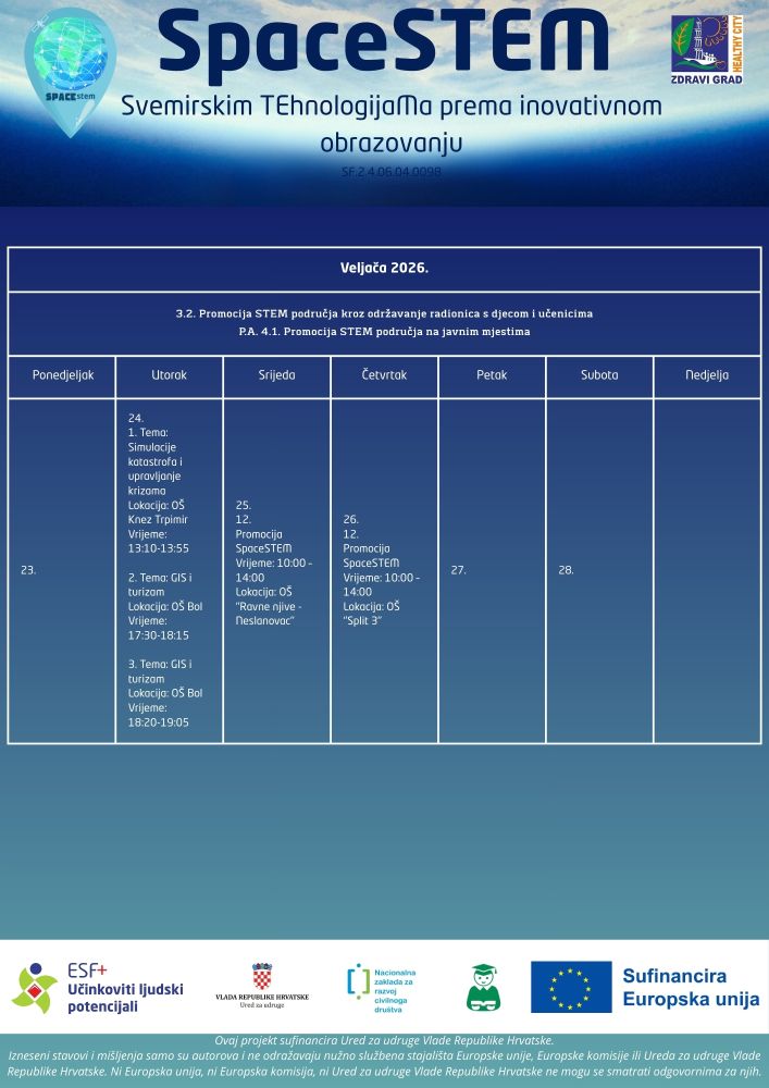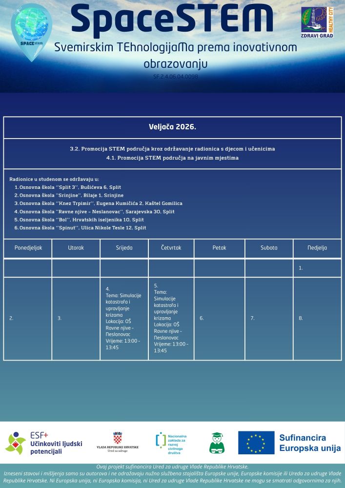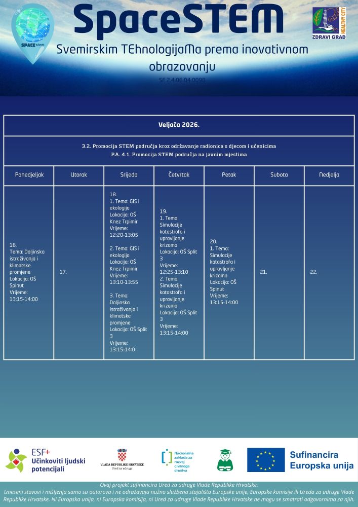 Udruga Zdravi grad i partneri nastavljaju s provedbom projekta SpaceSTEM – Svemirskim TEhnologijaMa prema inovativnom obrazovanju, koji već mjesecima uspješno popularizira svemirske tehnologije, GIS i održivi razvoj među učenicima osnovnih škola.
