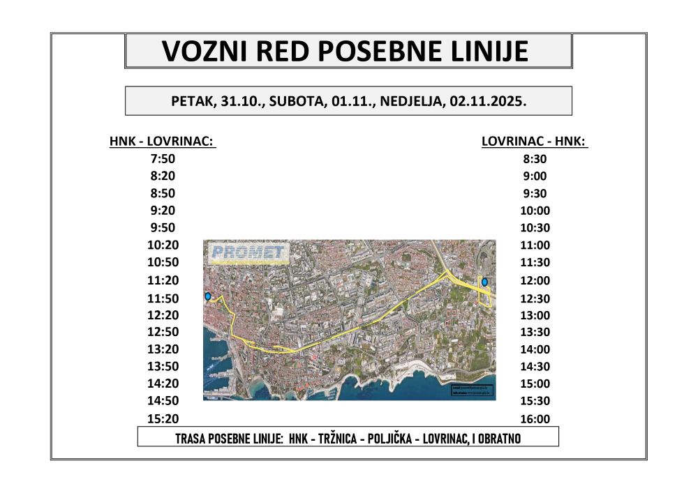 Dodatna linija prometovat će u petak, 31. listopada, subotu, 1. studenog, i nedjelju, 2. studenog 2025., svakih 30 minuta, i to: od HNK prema Lovrincu od 07.50 do 15.20 te od Lovrinca prema HNK-u od 08.30 do 16 sati.