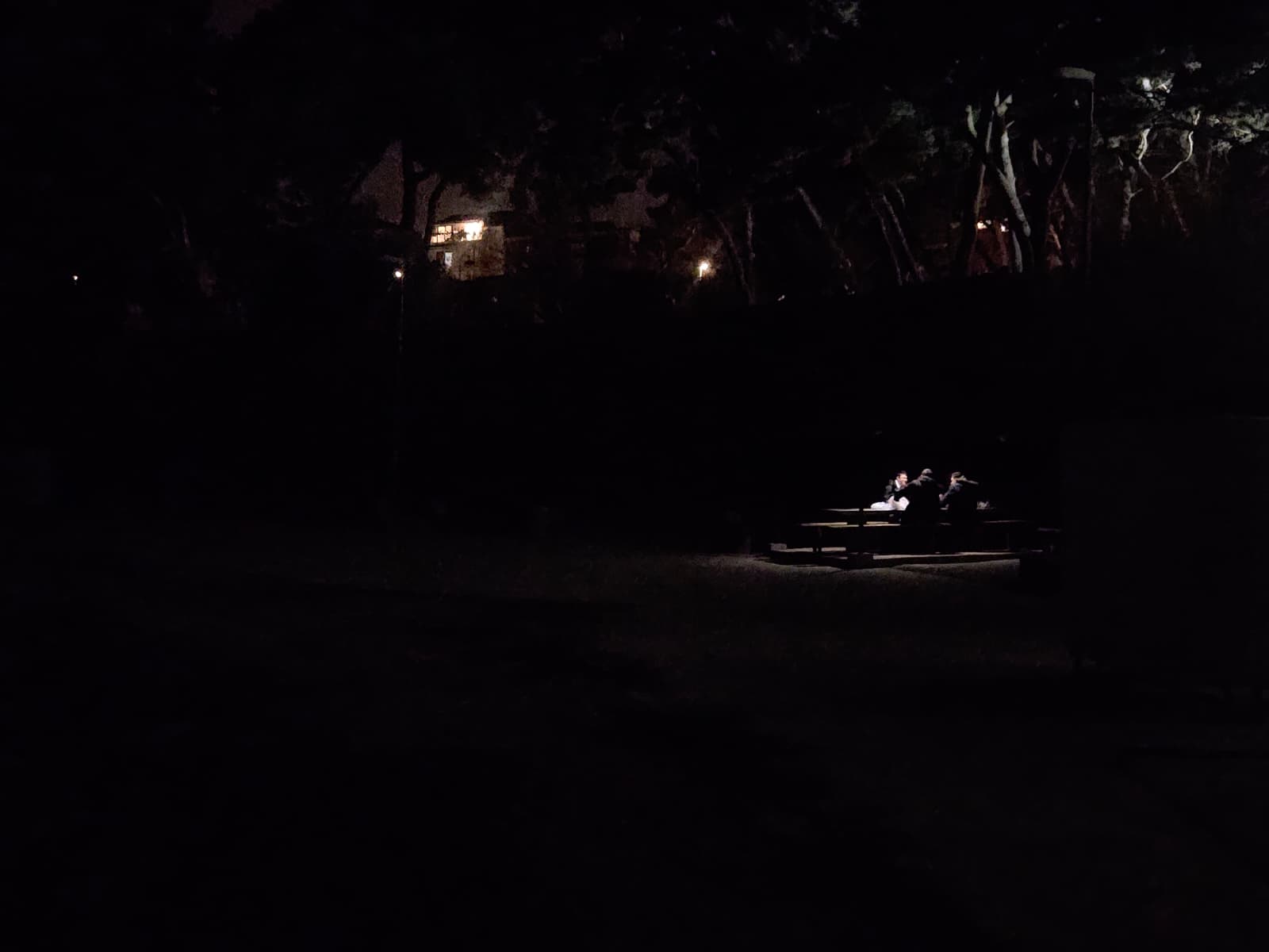 Rasvjeta u Šumici iznad Ovčica ne pomaže previše. Tek blago ambijentalno svjetlo daje naslutiti obrise prostora i dodatno naglašava koliko je ostatak plaže u mraku.
