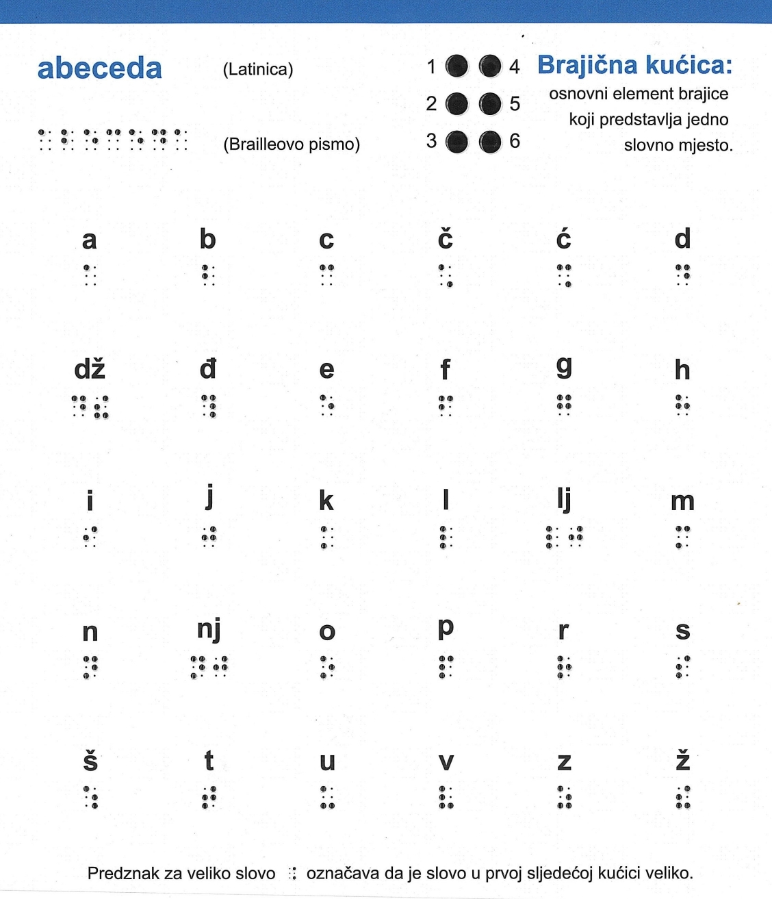 Kako se danas uči brajica? Zbog svoje univerzalnosti i prilagodljivosti 'brajica' je do danas ostala temeljni način opismenjavanja slijepih učenika u obrazovnim institucijama diljem svijeta. Učenje brajice započinje puno prije taktilnog čitanja uzdignutih točkica na papiru. Učenici prvo prolaze vježbe za razvoj taktilne osjetljivosti, odnosno uče kako precizno koristiti jagodice prstiju, snalaziti se u prostoru stranice i razlikovati sitne razlike u ispupčenju. Nakon toga postupno se savladava brailleova abeceda, znak po znak, slovo po slovo, uz oznake za interpunkciju i brojeve.
