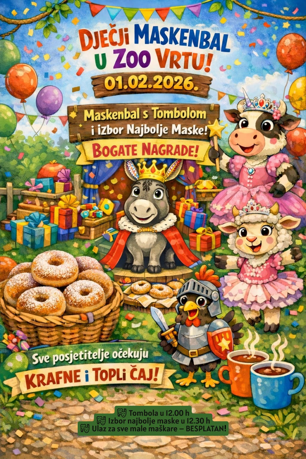Program završava u 13.30 sati podjelom krafni, uz slobodno druženje, fotografiranje i uživanje u posebnoj maskenbalskoj atmosferi Zoo vrta Split.