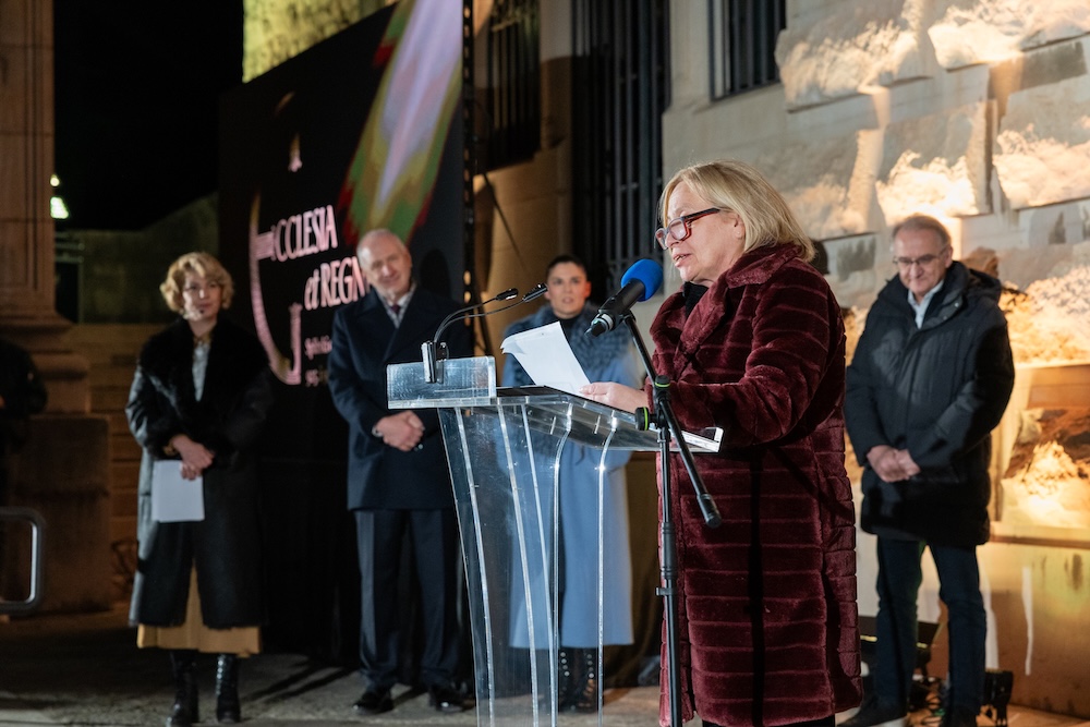 Prigodnu riječ uputila je i izv. prof. dr. sc. Maja Petrinec te podsjetila je da je ideja izložbe nastala 2023. godine kao inicijativa za predstavljanje sakralne baštine vezane uz vrijeme kralja Tomislava i splitskih sabora, te se postupno proširila na čitavu mrežu biskupija unutar tadašnje metropolije. Zahvalila je širokom autorskom i stručnom timu na suradnji, ističući da izložba okuplja više od 350 predmeta iz gotovo 40 institucija. Naglasila je da svaki izloženi spomenik svjedoči o zajedničkom kulturnom nasljeđu koje je kroz stoljeća oblikovalo duhovni i identitetski prostor hrvatskog naroda.