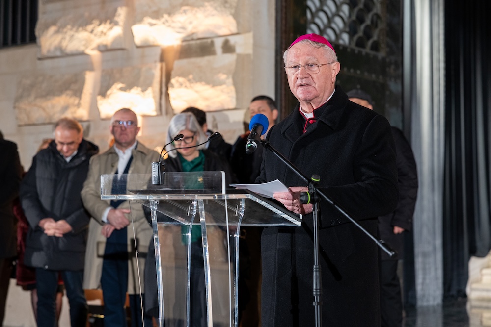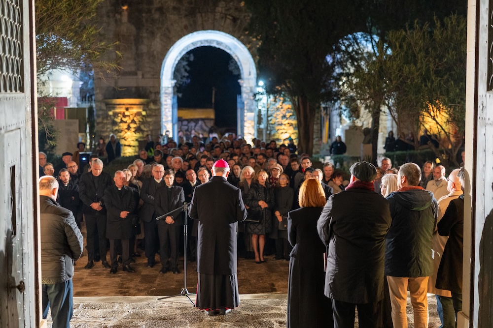 Zatim je pozdravnu riječ uputio splitsko-makarski nadbiskup i metropolit Zdenko Križić, koji je u svom obraćanju naglasio povijesnu i duhovnu važnost 925. godine, kada se hrvatski vladar Tomislav prvi put spominje s kraljevskim naslovom. Istaknuo je da su odnosi Crkve i Hrvatskoga Kraljevstva kroz stoljeća bili 'dugi, mnogostruki i višeslojni', te se osvrnuo na istaknute splitske nadbiskupe čiji su doprinosi kulturi, reformi i obrazovanju snažno oblikovali identitet grada. Naglasio je kako izložba, predstavljajući dragocjene povijesne spomenike, otvara prostor za ponovno čitanje i razumijevanje baštine koja i danas govori o našoj vjeri, kulturi i povijesti. Zaključujući obraćanje, nadbiskup je podsjetio i na nezaboravne riječi don Frane Bulića, dugogodišnjeg ravnatelja Arheološkog muzeja, koji je isticao da se 'iz kamena rađa povijest, iz povijesti svijest, a iz svijesti sloboda'.