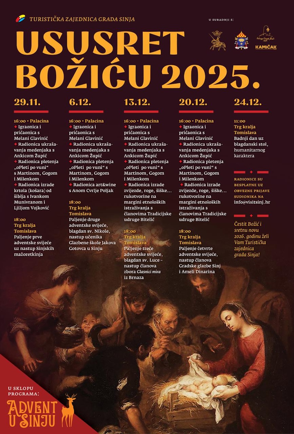 'Uoči Božića, na Badnjak, u prijepodnevnim satima, na Trgu kralja Tomislava, ponovno ćemo se udružiti uz pjesmu, ukusnu hranu i piće. Uz već prigodne nastupe zborova i klapa i koncert na otvorenom, organizirat ćemo besplatnu podjelu predbožićnih posnih delicija: bakalara, prženih srdela, kruha, fritula, kroštula, voća, likera i vina, u čemu će nam svesrdno pomoći vrijedne ruke članova udruge Sinjski ferali. Pridružite nam se u Sinju i osjetite pravi ugođaj Božićnih blagdana koji spajaju tradiciju i radost, glazbu i stvaralaštvo, svjetlost svijeća i toplinu susreta!', pozivaju iz TZ grada Sinja.