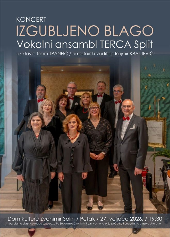 Vokalni ansambl Terca iz Splita, uz Tonča Tranfića na klaviru, održat će koncert 'Izgubljeno blago', pod vodstvom umjetničkog voditelja Rajmira Kraljevića, u solinskom Domu kulture 'Zvonimir'. Zakatan je za petak, 27. veljače, u 19.30.