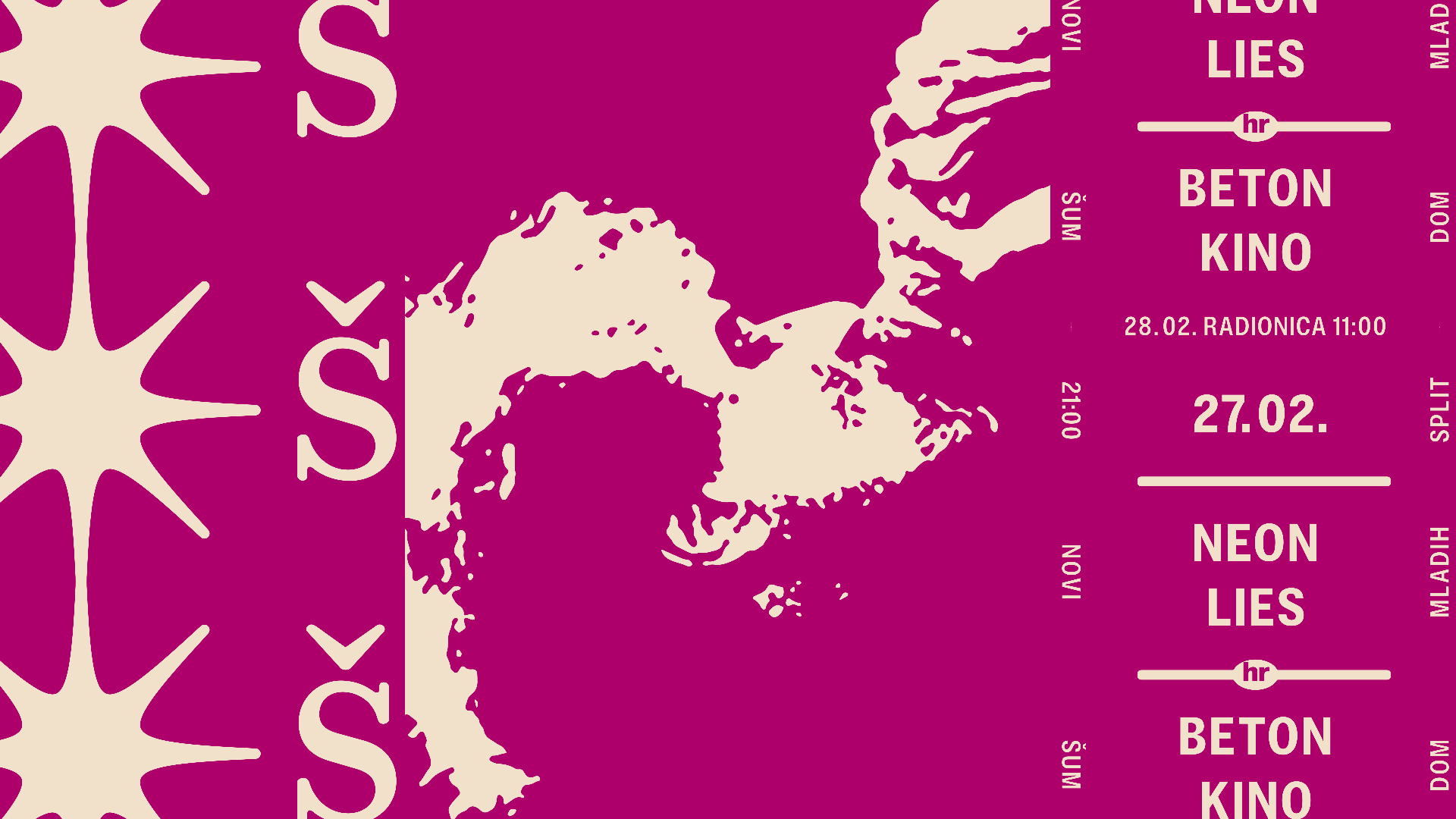 U sklopu programa Novi Šum, u organizaciji MKC-a, u Beton Kino Doma mladih stiže Neon Lies. Nakon brojnih europskih pozornica, pred splitskom publikom održat će koncert i predstaviti svoj jedinstveni analogni darkwave zvuk. Nastup je na rasporedu u petak, 27. veljače, u 21 sat, a u subotu 28. veljače u 11 sati slijedi i besplatna radionica o analognom snimanju i produkciji elektronske glazbe.