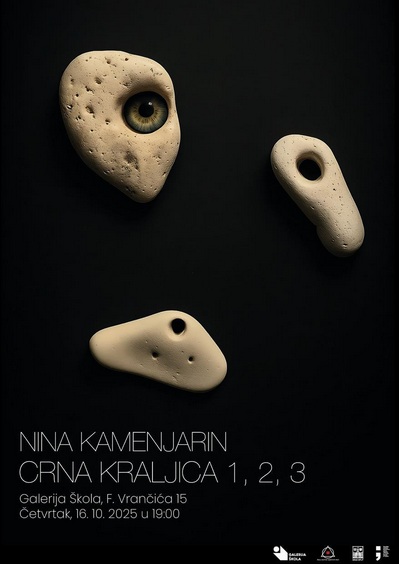 'U goste nam stiže Nina Kamenjarin, zapažena hrvatska suvremena umjetnica mlađe generacije i naša nekadašnja učenica. U reprezentativnom interijeru - izlogu Galerije Škola izvest će rad pod nazivom Crna kraljica 1, 2, 3. Crna kraljica je igra, žena, arhetip, mit. Ovaj intrigantan rad trajat će sat vremena i 30 minuta', poručuju iz Galerije.