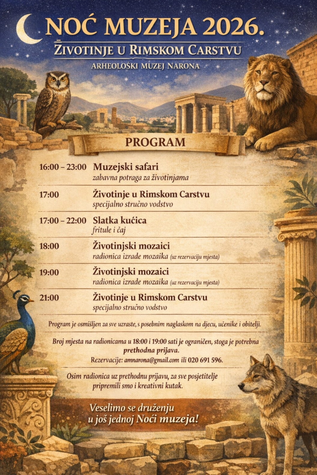 Arheološki muzej Narona i ove se godine uključuje u manifestaciju Noć muzeja. Ovogodišnja tema je 'Životinje u Rimskom Carstvu', kroz koju će posjetitelji upoznati ulogu životinja u svakodnevnom, simboličkom i religijskom životu antičke Narone.