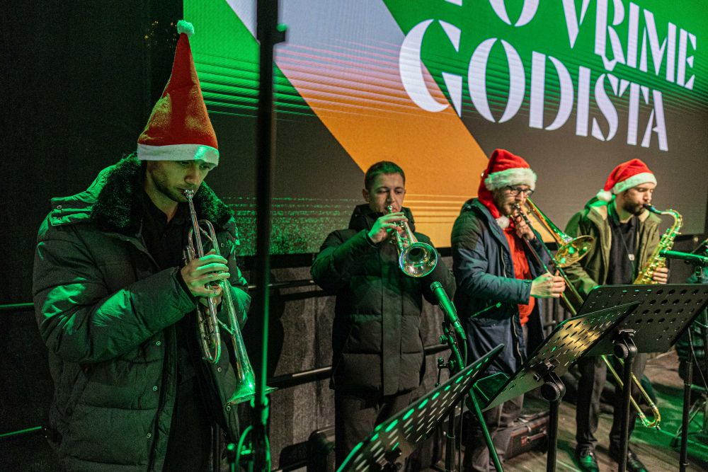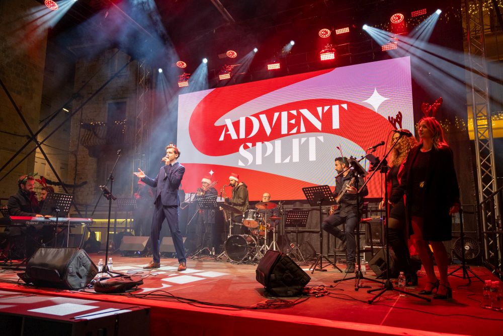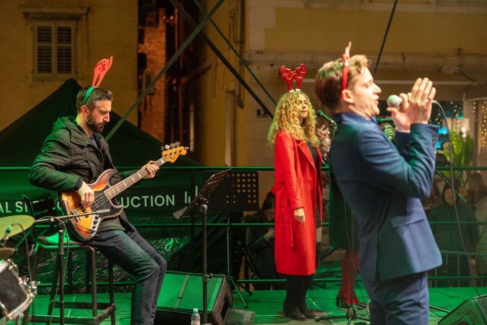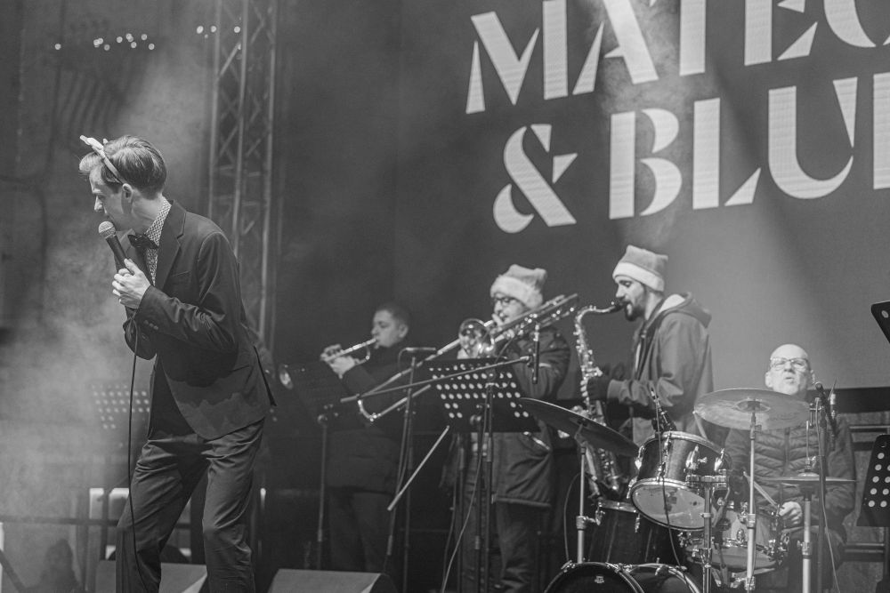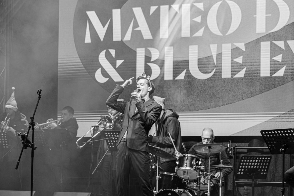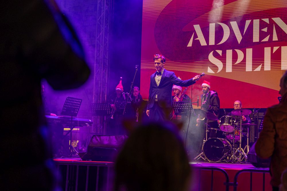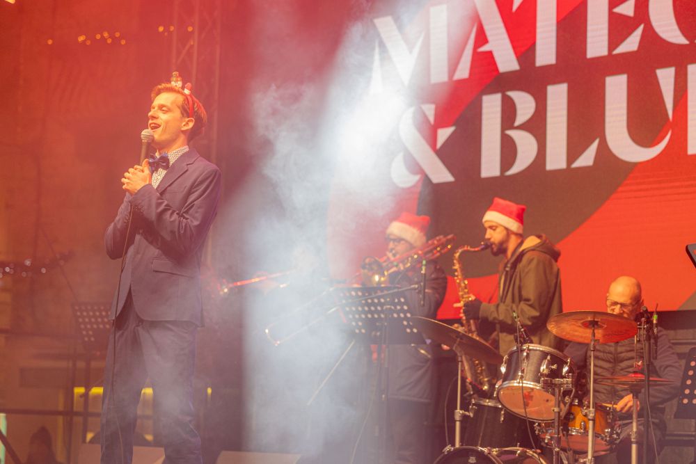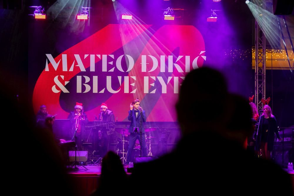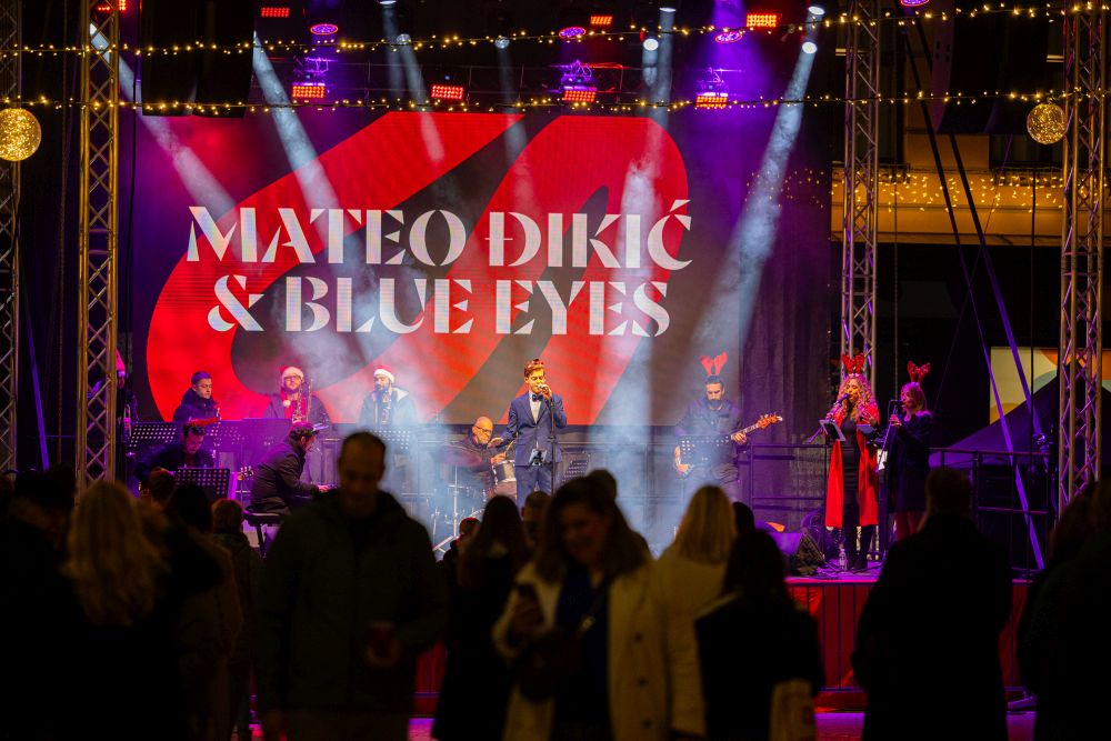 Splitska Pjaca večeras se pretvorila u filmsku kulisu u kojoj su Mateo Đikić i Blue Eyes publici donijeli jazz standarde, božićnu filmsku glazbu i bezvremenske evergreene, prizivajući atmosferu 50-ih i 60-ih godina prošlog stoljeća. Uz pjesme Deana Martina, Franka Sinatre, Ive Robića i drugih glazbenih velikana, večer je protekla u znaku elegancije, nostalgije i posebnog blagdanskog ugođaja.