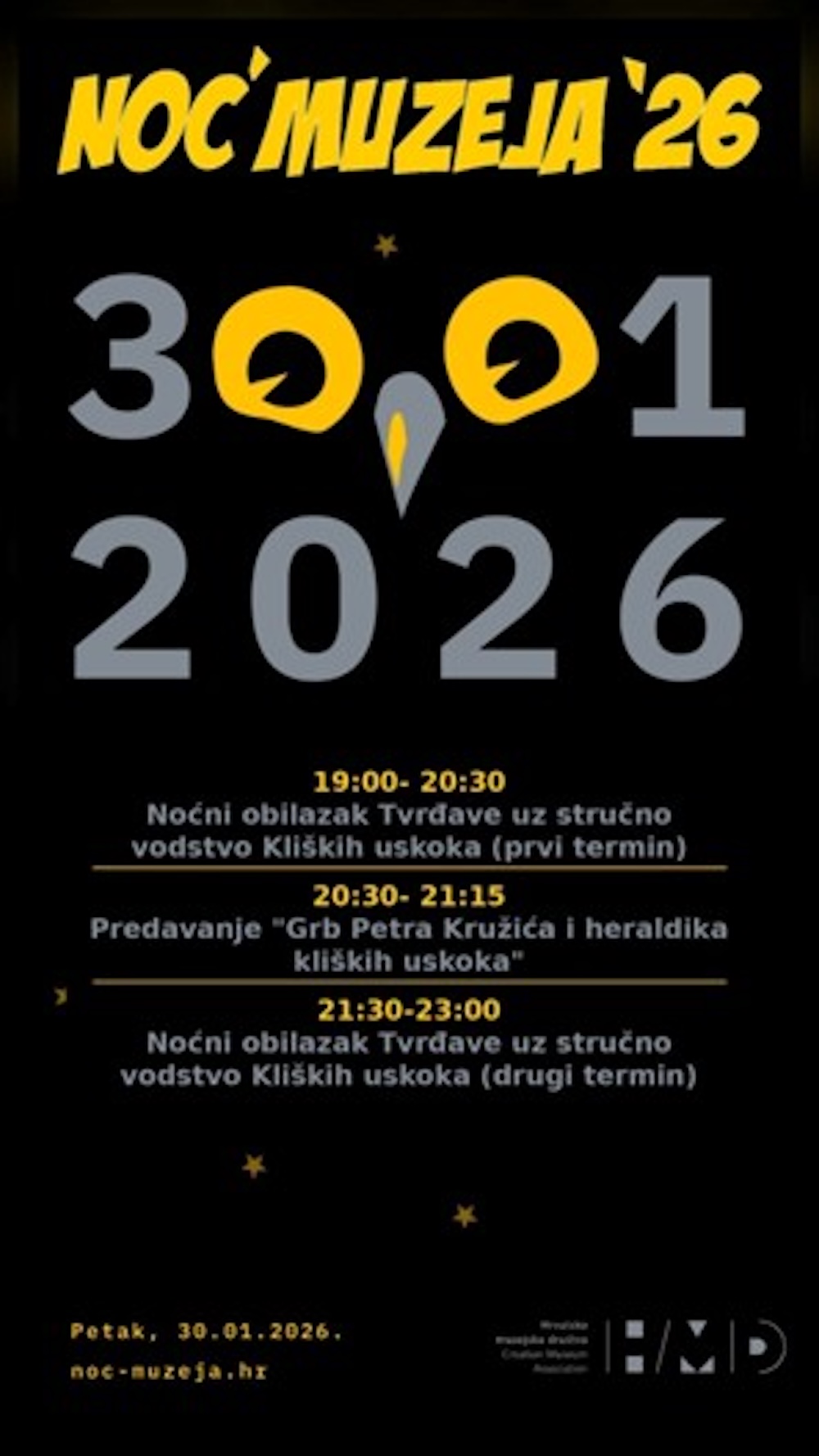 Izlaganju pod naslovom 'Grb Petra Kružića i heraldika kliških uskoka', koje će se održati na tvrđavi Klis u Topničkoj vojarni, prethodit će noćni obilazak tvrđave uz stručno vodstvo 'Kliških uskoka' s početkom u 19.30 sati, dok će isti program obilaska tvrđave biti nastavljen i nakon održanog izlaganja (u 21.30 sati). Programom Noći muzeja 2026. Škola heraldike će ujedno započeti s ukupno petim ciklusom svojih aktivnosti, dok su teme izlaganja, prezentacija i radionica održanih u Klisu, Splitu, Solinu, Kaštelima i Segetu tijekom proteklog desetljeća bile sljedeće: