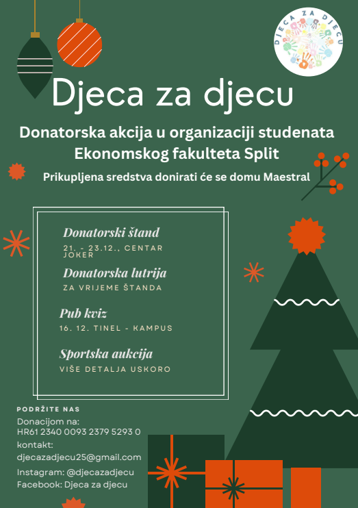 Studenti Ekonomskog fakulteta u Splitu i ove godine organiziraju donatorsku akciju Djeca za djecu, koja se održava već 12. godinu, u okviru kolegija Upravljanje manifestacijama pod vodstvom prof. dr. sc Smiljane Pivčević. Riječ je o studentskoj volonterskoj inicijativi u sklopu koje se kroz razne aktivnosti prikupljaju sredstva za pomoć djeci i udrugama kojima je pomoć najpotrebnija.