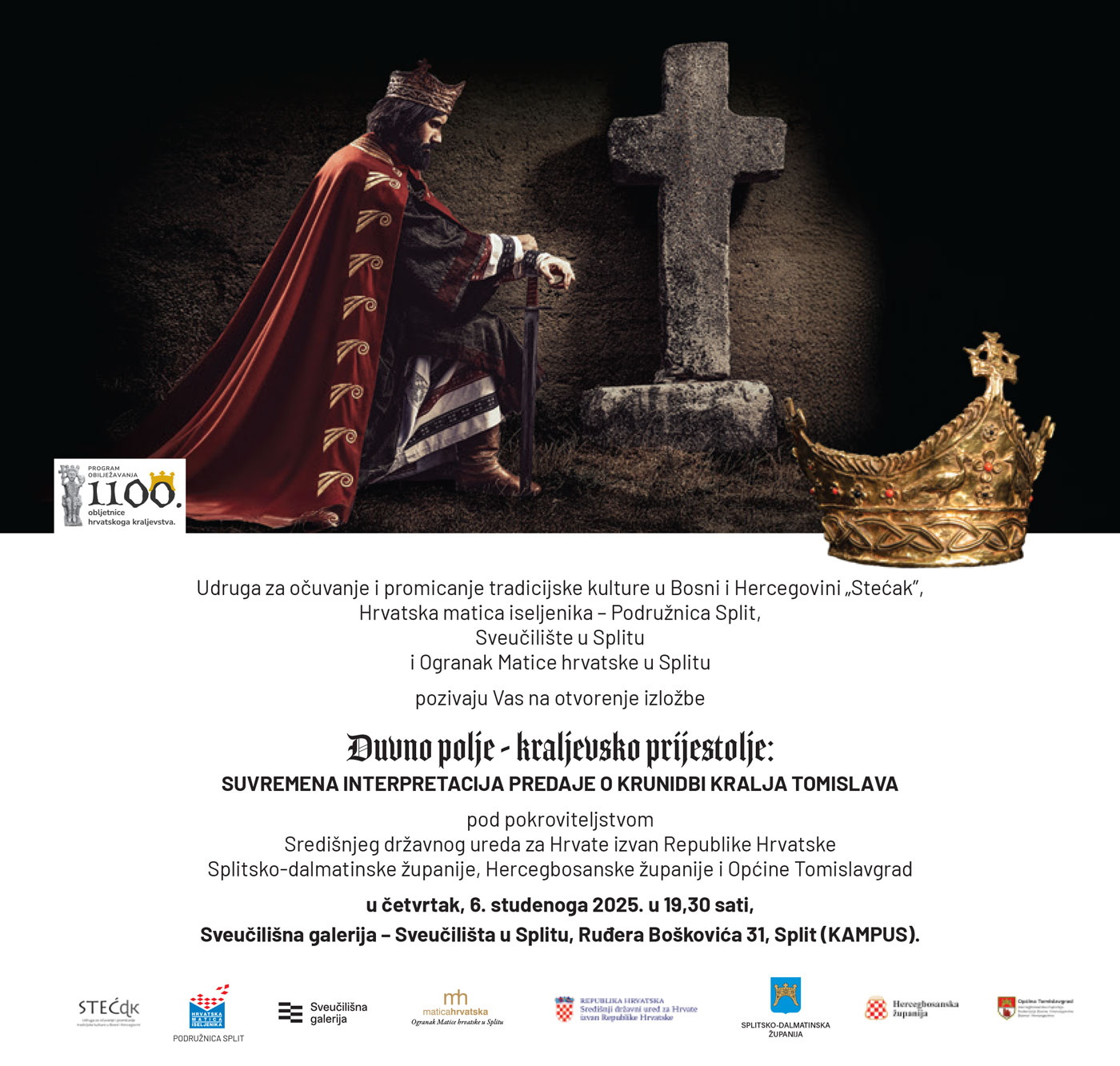 Udruga za očuvanje i promicanje tradicijske kulture u Bosni i Hercegovini 'Stećak', Hrvatska matica iseljenika - podružnica Split, Sveučilište u Splitu i ogranak Matice hrvatske u Splitu pozivaju na otvorenje izložbe 'Duvno polje - kraljevsko prijestolje: suvremena interpretacija predaje o krunidbi kralja Tomislava', koja će se održati u četvrtak, 6. studenoga u 19.30 sati, u Sveučilišnoj galeriji, Ruđera Boškovića 31, Split.