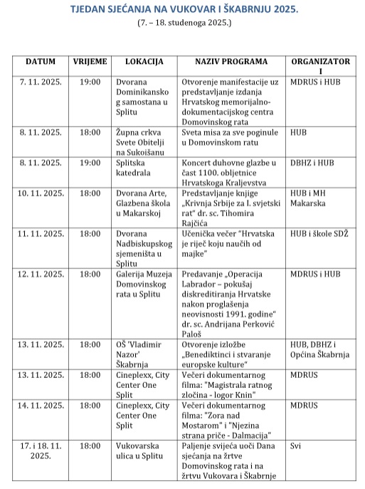 U petak u Splitu počinje 'Tjedan sjećanja na Vukovar i Škabrnju', tradicionalna društveno-kulturna manifestacija u organizaciji Hrvatske udruge Benedikt, koja se već dvanaest godina održava u Splitu i na području Splitsko-dalmatinske županije, ove godine uz partnerstvo Muzeja Domovinskog rata u Splitu.